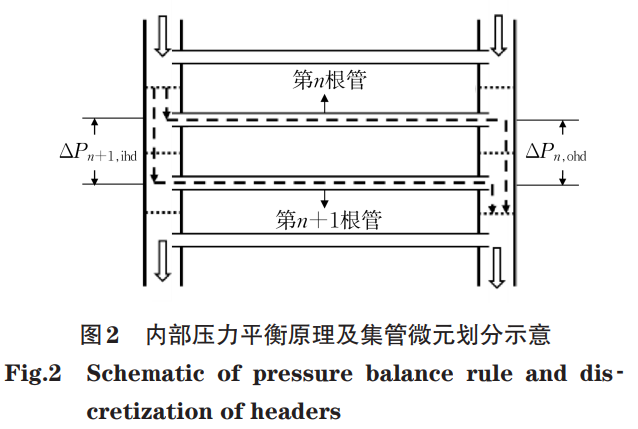 式中:ΔPcontraction、ΔPexpansion和ΔPfriction和ΔPacceleration/deceleration分别为分流产生的收缩压降、合流产生的膨胀压降、管内摩擦压降和加速/减速压降,Pa。图2给出了管子系统内部压力平衡的原理和集管微元的划分方法。根据流体力学原理,流网中任意2个节点之间的压降必然相等。图2中虚线表示2条相邻扁管的制冷剂流动路径,它们具有相同的起点和终点,这2条相邻的流动路径间的压降关系如式(5)所示: